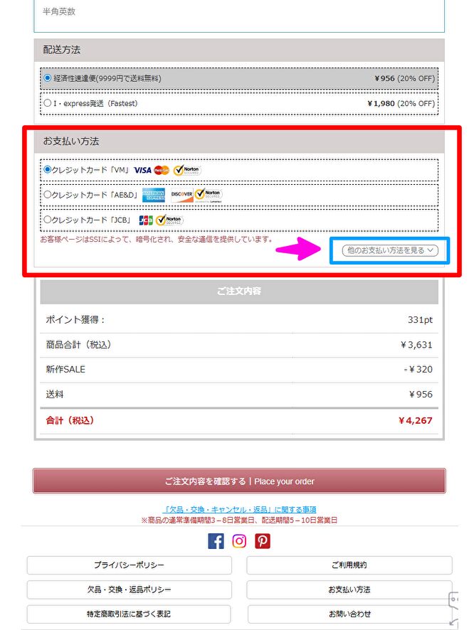 欲しいアイテムをカートに入れて、実際の支払い画面に行くと、下記画像にような支払方法のページになります。